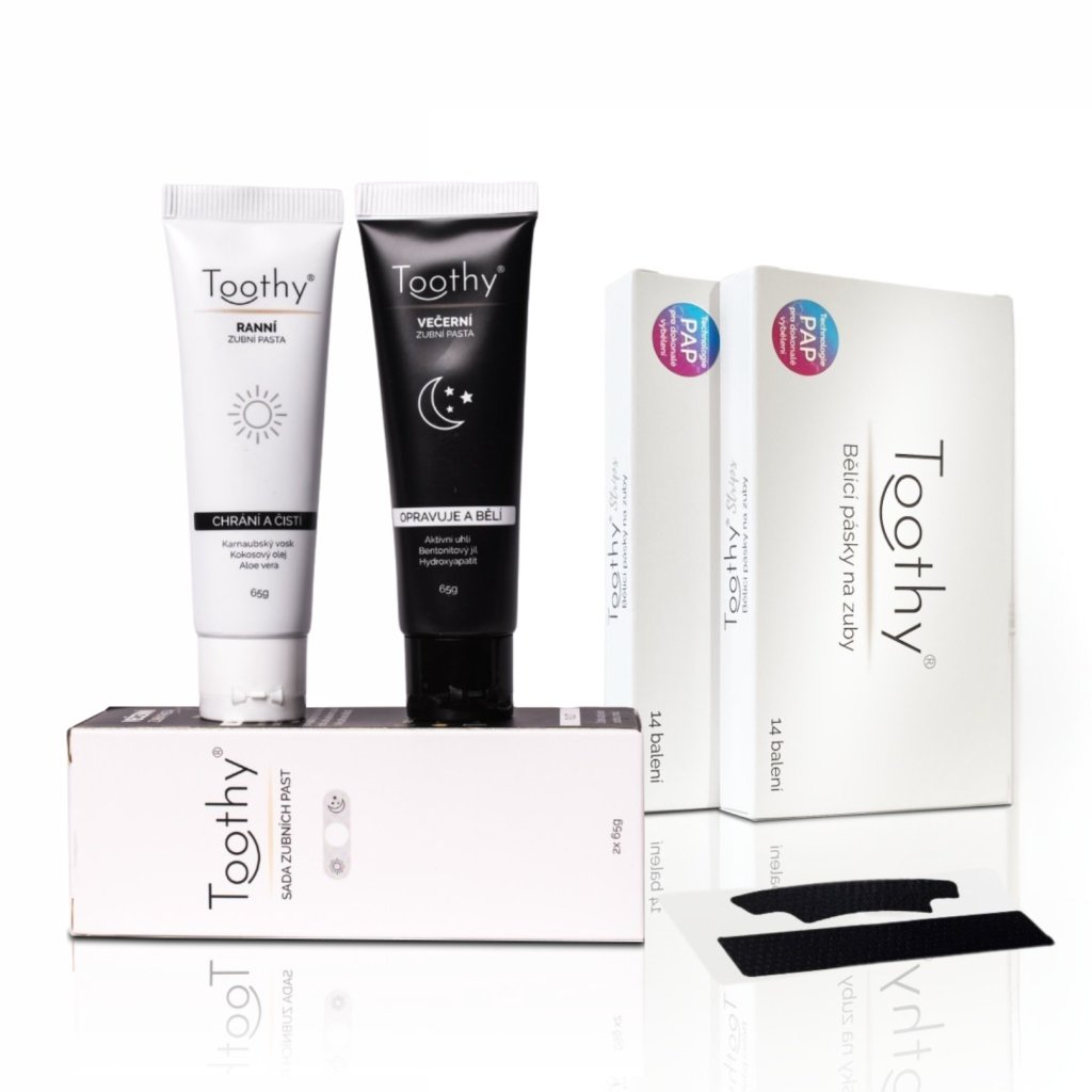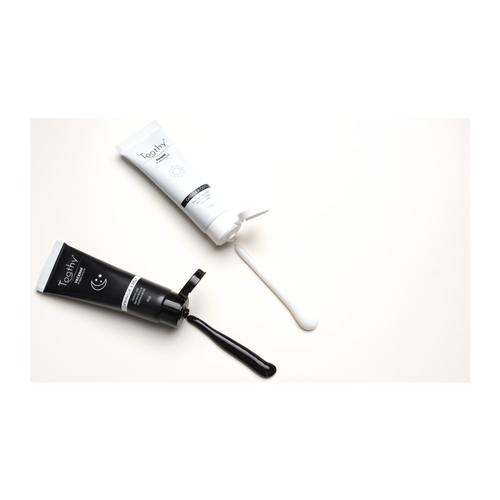 Toothy®️ All Day Care je unikátní sada ranní a večerní zubní pasty. Zuby potřebují naprosto odlišnou péči podle toho, zda je ráno, nebo večer a my jsme na to mysleli. Ranní pasta s příchutí kokosu dokonale vydezinfikuje ústa a díky karnaubskému vosku na zubech vytvoří film, který je celý den chrání. Večerní pasta zuby po celém dní opraví díky bentonitovému jílu, a zároveň je rozzáří a vybělí díky aktivnímu uhlí a Hydroxyapatitu.